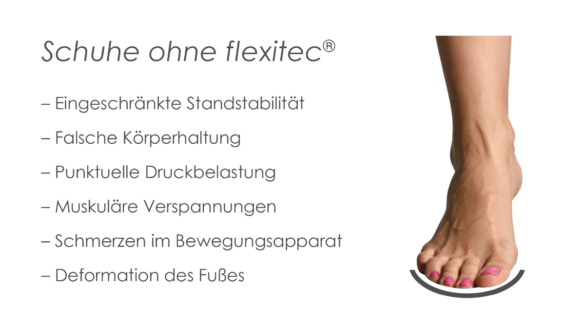 "Instabiles Schuhwerk hat massive Auswirkungen auf den Körper. Kräfte, die auf den Fuß wirken, werden auf den ganzen Körper übertragen. Schmerzen im Knie, in der Hüfte oder in der Wirbelsäule können zum Beispiel auch durch äußere Einflüsse, oder durch eine Deformation des Fußes, speziell durch eine falsche Schuhkonstruktion auftreten. Durch die innovative Technologie der flexitec® Federstahlsohle entsteht eine bessere Druckverteilung und somit optimale Kraftverteilung in der Bewegung. Die patentierte Wellenanordnung entspricht dabei dem natürlichen Abrollverhalten des Fußes. Schuhe und Füße werden vor Deformation geschützt."